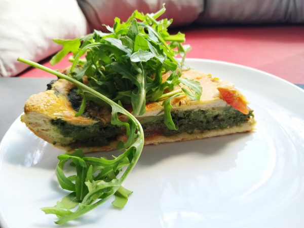 Wspaniała, smaczna tarta, z pysznie przyrządzonym szpinakiem. Królewsko podana.